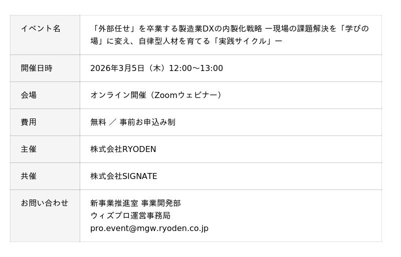 株式会社RYODENは、株式会社SIGNATE(以下、「SIGNATE社」)と当社ウィズプロとの共催で「外部任せ」を卒業する製造業DXの内製化戦略 ー現場の課題解決を「学びの場」に変え、自律型人材を育てる「実践サイクル」ーを2026年3月5日(木)に開催します。