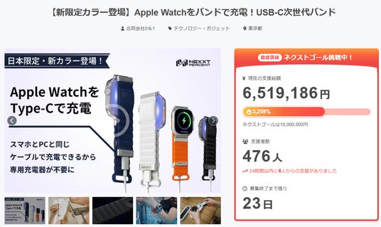 合同会社0&1は、2025年12月25日より「CAMPFIRE」でプロジェクト「【新限定カラー登場】Apple Watchをバンドで充電!USB-C次世代バンド」を開始し、支援受付をスタートしました。