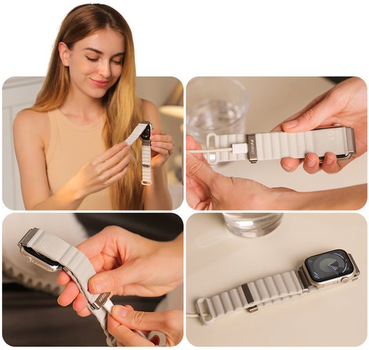 バンドにワイヤレス充電モジュールを内蔵し、USB-Cポート経由でApple Watchをスマートに充電できるよう設計されています。
