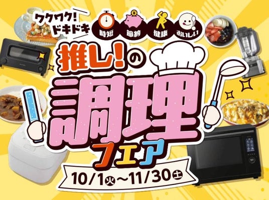 株式会社エディオンでは、エディオングループ直営店舗全店にて、2024年10月1日(火)から11月30日(土)まで「推し!の調理フェア」を開催します。期間中、調理家電2点以上かつ合計金額70,000円以上の同時購入で10%割引など、限定特典を多数ご用意しております。共働き世帯の増加に伴う時短志向、物価や光熱費の高騰による節約ニーズの高まり、そして近年ますます重視される健康を意識した最新の調理家電が勢ぞろい。一部店舗では、人気商品を使った調理実演会も行います。家電のプロ、エディオングループの社員がおススメする”推し”の家電を、ぜひこの機会にお試しください。