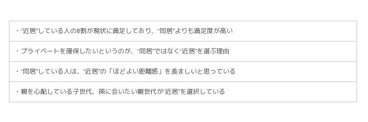 調査の結果、「親・子供の面倒を近くで見たい」という意見が多い一方で、「プライベート空間を確保したい」という意見も多く、“近居”という住まい方はこれからますます注目されるでしょう。