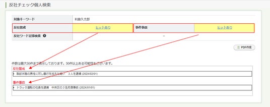 検索結果は「反社警戒」、「事件事故」の2カテゴリに分類され、リスクの所在をハイライト表示します。視覚的・直感的にチェックした上で、ハイライトされたマスをクリックすると詳細情報を確認できます。