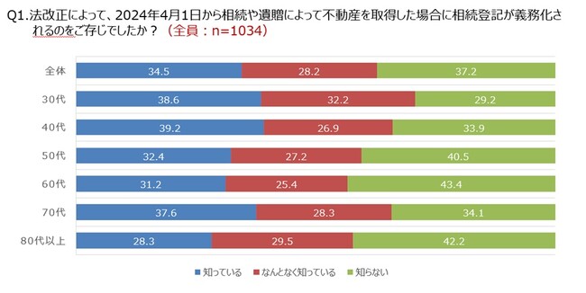 「法改正によって2024年4月1日から相続や遺贈によって不動産を取得した場合に相続登記が義務化されるのをご存じでしたか?」という質問に対しては、全体の約4割の人が「知らない」と回答しています。年代別にみると50・60代と80代以上では4割以上の人が認知しておらず、30・40代と70代はいずれも3割程度になっています。認知度が高い年代は、近いうちに相続に関わる年代とみられ、関連する情報を収集しているものと思われます。