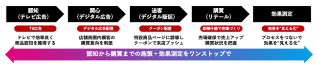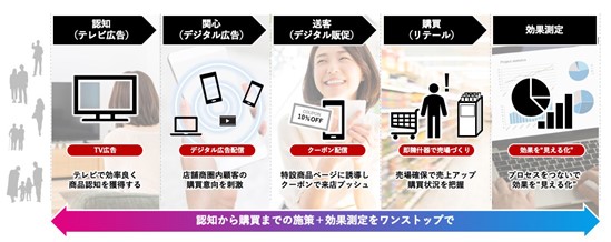 生活者と企業とのあらゆる接点がデジタル化し、常時・双方向でつながる時代、活用可能なデータも多様化しています。企業の宣伝・マーケティング担当者は広告施策の費用対効果向上に向けた高度なマネジメントが求められています。そのための手段のひとつとして、生活者が商品やサービスを認知してから購買するまでのさまざまなコミュニケーション施策を効果的に連携することが重要です。しかし、これまでテレビとデジタルとの連携、テレビと店頭をつなぐ流通企画、デジタル広告と効果検証をつなぐ施策などは個別に存在していましたが、これらの施策群は分断されていました。
