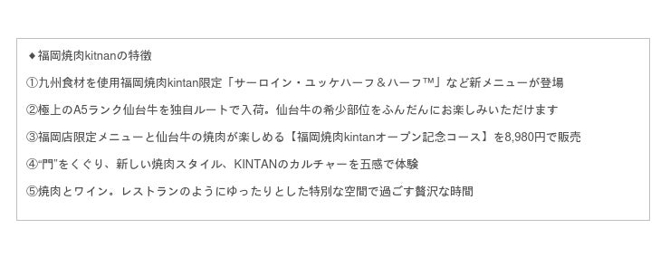 カジュアル・リッチな焼肉レストランとしてランチをはじめ、記念日のお食事や会食、デートで多くのお客様にお楽しみいただき今日に至ります。今回、西日本初出店となる福岡焼肉kintanのコンセプトは“門”。九州は古くから港町として栄えていました。江戸時代、徳川幕府が鎖国政策をおこなってからも“日本の門”として唯一、海外貿易を行っていた商業都市です。私たちの焼肉スタイル、KINTANのカルチャーを福岡大名の店舗、“門”を通じて福岡の皆様にお届けしたいという想いでKINTANは福岡に初出店いたします。