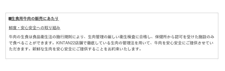 KINTANのある街の人々に「焼肉」と「KINTANの空間」と「サービス」を通じて、日常では得がたい“幸福感”や“豊かさ”を感じてもらえるよう、「その街で1番愛される焼肉レストラン」を目指して日々営業しております。30日間熟成KINTANや日本一のサーロイン・ユッケ(TM)、骨付きKINTANミスジが好評です。