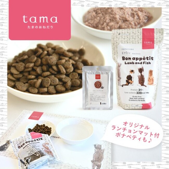 2014年誕生のプレミアムキャットフード専門店・通販「たまのおねだり(tama)」は、猫のために“猫本来の食生活を探求する”というコンセプトのもと、私たち猫好きが猫から「おねだり」される様な商品をセレクトし、猫がおいしく食べてずっと健康でいられることを願い、猫のことを大切に想う人たちと共に学び、成長しながらより良いサービスと品揃えを目指しています。2019年から発売しているオリジナル総合栄養食【tamaボナペティ】は、室内で暮らす小さな肉食獣が満足するおいしさに加え、ずっと元気で過ごしてもらうために栄養バランスを熟考。泌尿器・毛玉・体重コントロールなどにも配慮し、かわいい猫の健康のために考え尽くしたフードです。