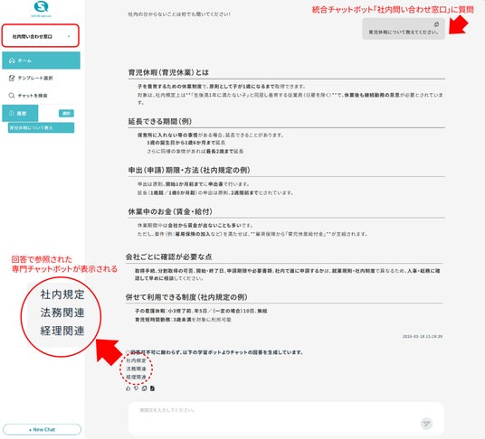 下図は育児休暇についての社内問い合わせを想定した利用イメージです。複数部門にまたがる問い合わせも、「社内規定」「法務」「経理」など、複数の専門チャットボットを統合した「社内問い合わせ窓口」に質問するだけで、AIが関連するボットの知識を横断して回答を自動生成します。