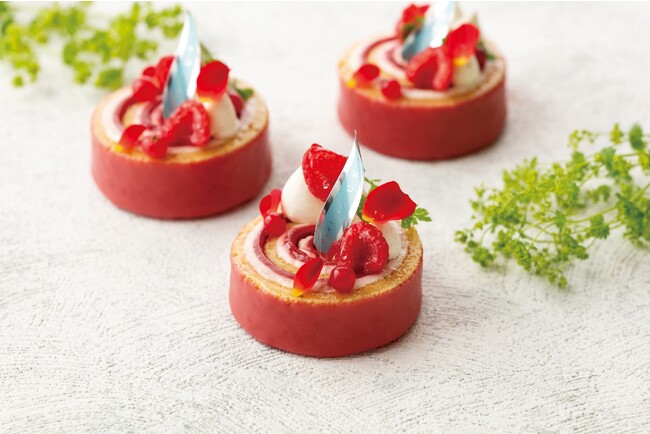 しっとりしたアーモンド生地に、バニラ香るホワイトチョコとマスカルポーネクリーム、イチゴジュレを巻き込んだロールケーキ。10 年分の感謝と「これからも末永く愛されるお店であるように」という願いを込め、年輪に見立てた層で表現しました。