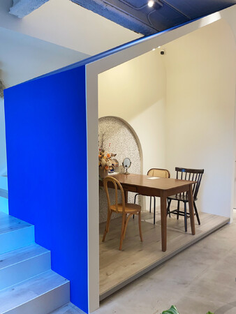 新設した階段のスロープを屋根に見立て、その下を遊び心のあるの接客スペースとしており、ゆるやかに区切られた客席では、お客様専任のコンシェルジュがじっくりご相談を承ります。近代的なビルと大通りの賑わいと、こぢんまりとした一軒家のような寛いだ空間のコントラストをお楽しみください。