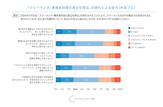 外部のプロについて、どの項目も「非常にそう思う」の割合が10%を下回っており、 「フリーランス・事業者間取引適正化等法」施行に伴う変化への期待があまり高くないことが伺えます。