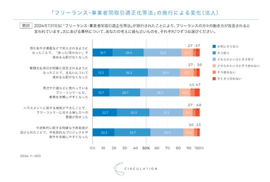 法人担当者について、項目別に特に大きな差は見られませんでしたが、「支払いについて揉める心配がなくなった」「フリーランサーに対する接し方への意識が高まった」「中長期的なプロジェクトや案件を依頼しやすくなった」で「そう思う」「非常にそう思う」と選択した割合が、それぞれ50%を超えており、企業側からもフリーランスの方々と一緒に働く環境・状況の改善への期待が高いことが伺えます。