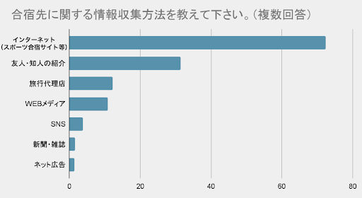 合宿先を検討する際の、情報収集方法において最も多かった回答は「インターネット(スポーツ合宿サイト 等)」であった。宿泊施設の概要や周辺施設の状況等が1つにまとまっている点が利用者にとってメリットになっているのではないかと考えられる。