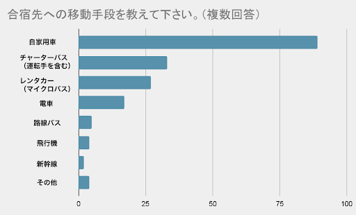 合宿先への移動方法は「自家用車」を利用するという回答が一番多かった。続いて「チャーターバス(運転手を含む)」「レンタカー(マイクロバスを含む)」と車が主な移動手段となっていることがわかった。スポーツ合宿は、用具などを多く持ち運ぶため「新幹線」などの公共交通機関を使用する機会が少ないと考えられる。