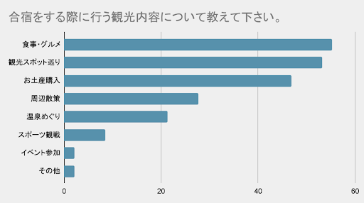 合宿の際に行なわれるチームでの観光の内容は「食事・グルメ」が最も多いことがわかった。「スポーツ観戦」や「イベント参加」などの割合は低く、「観光スポット巡り」や「お土産購入」など合間の時間で実施できる観光の割合が高いことがわかった。