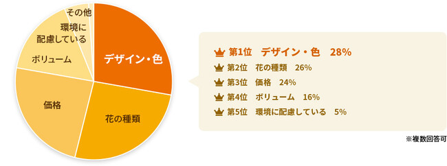 問2:花ギフトで重視することは何ですか?「デザイン・色」が最も多い結果となりました。続いて「花の種類」「価格」となりました。母の日の花といえばカーネーションというイメージが定着していますが、花の種類よりもデザインや色を重視する傾向となりました。