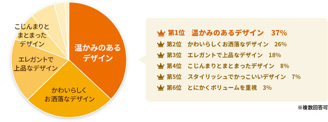 問3:贈りたい花ギフトのデザインは何ですか?「温かみのあるデザイン」が最も多く、全体の37%となりました。2番目に多かった「かわいらしくお洒落なデザイン」とは9ポイントの差がありました。お母さんに「温かい気持ち」を伝えたいと考える方が多いようです。