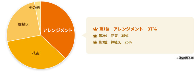 実施概要調査対象:15歳以上の男女回答者数:母の日に花を贈りたいと答えた229名実施日:2023年4月12日調査方法: WEBアンケート調査■調査結果詳細問1:どんな花ギフトを贈りたいですか?「アレンジメント」が最も多く、37%という結果になりました。アレンジメントとは、花器と呼ばれるバスケットなどの容器に吸水性スポンジを入れ、そこに花を生けたスタイル(形)です。花瓶に生け直す必要がないため、受け取ったまま自宅で飾ることができます。簡単に飾れて手入れがしやすいため、気軽に贈れる花ギフトです。