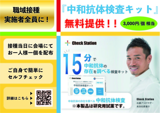 さらに今回の3回目の職域接種会場において、弊社の新型コロナ検査サービス「Check Station」で展開している1.中和抗体検査(3,000円相当)を全員に無償提供し、2.復興あんしんパスポート(あんパス)を希望者に無料発行いたします。