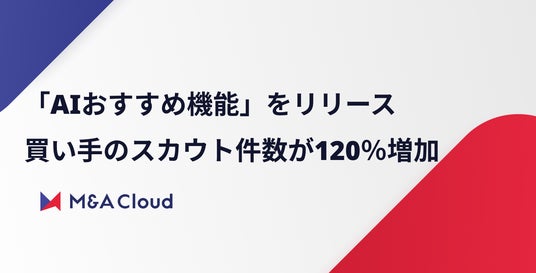 株式会社M&Aクラウド(本社:東京都新宿区、代表取締役CEO:及川厚博、以下「当社」)が提供するM&Aマッチングプラットフォーム「M&Aクラウド」は、買い手企業が登録をした買収ニーズにマッチするおすすめ売却案件情報をお知らせする「AIおすすめ機能」をリリースしました。これにより、買い手企業と売り手企業のマッチング精度は約4倍向上しスカウト件数は120%に増加しました。