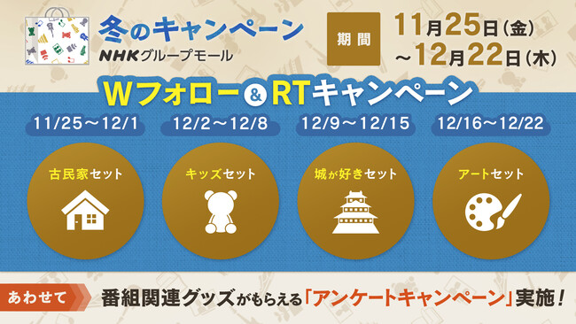 NHK関連グループ各社の各ECサイトやコンテンツと連携し、ダブルフォロー&RTキャンペーンを実施します。あわせて「アンケートキャンペーン」も実施します。