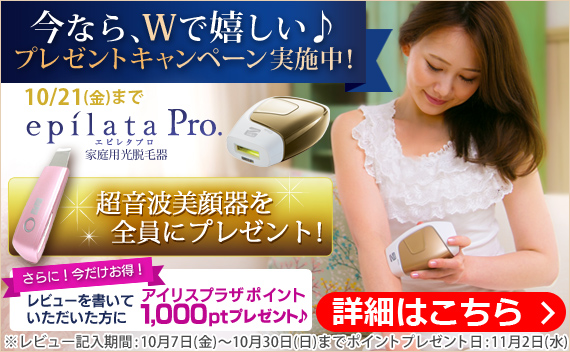 アイリスオーヤマ株式会社(本社:仙台市、代表取締役社長:大山 健太郎)のグループ企業である株式会社アイリスプラザ(宮城県仙台市青葉区中央2丁目1-7 アイリス青葉ビル TEL:0120-323-410)では、新商品の手軽にホームエステができる、家庭用光脱毛器「エピレタプロ EP-0230-N」ご購入者様対象に「超音波美顔器をもれなく全員にプレゼントキャンペーン」を2016年10月7日(金)10:00AM ~2016年10月21日(金)10:00AM まで実施しております。さらに、期間中「エピレタプロ EP-0230-N」のレビューを書いていただいた方に、アイリスプラザポイント1,000ptプレゼントいたします。2つの嬉しいプレゼントキャンペーンをぜひお見逃しなく。