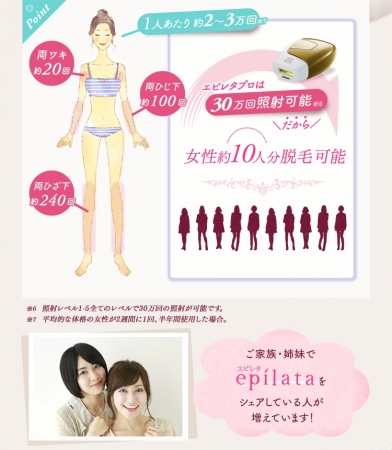 一般的な女性1人あたりの前身脱毛完了までに、約2~3万回(※3)の照射が必要と言われています。家庭用光脱毛器「エピレタプロ EP-0230-N」はカートリッジの交換が不要で30万回の照射が可能なので約10人分の照射が可能です。エステサロンに通うよりもずっと経済的です。