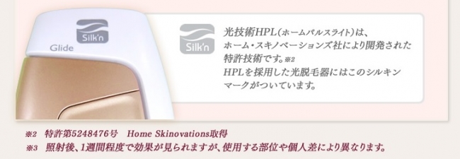 特許技術の光技術HPL(ホームパルスライト)は、光の照射に加え、超音波による振動で、肌にやさしい脱毛を可能にしました。「エステを予約してその都度サロンに通うのが大変…。」「エステは高額だし、もっと手軽に脱毛したい」というお客様の声にお応えし、エステと同じ効果をお家でいつでも体感できる、家庭用光脱毛器「エピレタプロ EP-0230-N」を発売しました。