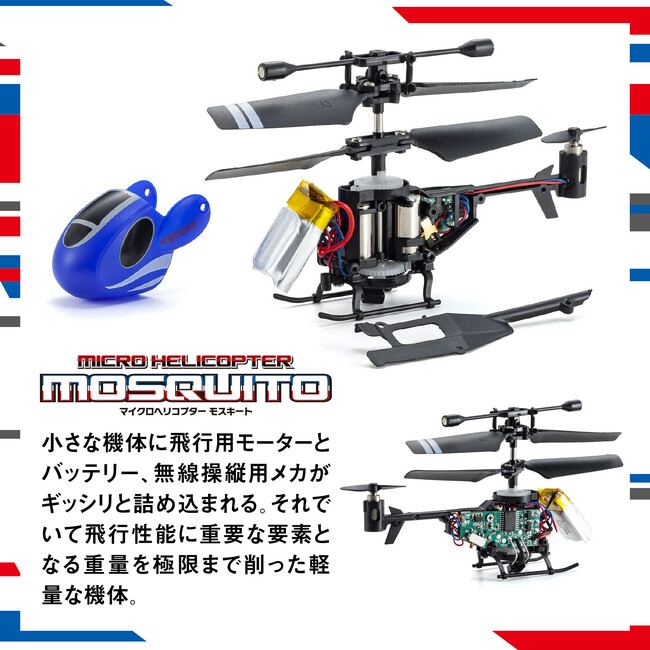 2012年から2014年にかけて京商より発売され、当時の累計販売台数は30万台以上の大ヒットモデルになった超小型ヘリコプターが「モスキート」です。全長約8cmというコンパクトな機体に精密メカを組み込み、リモートコントロールのヘリコプター操作に慣れていない人でも簡単に飛ばせます。まるで虫のようにキュートなルックス はとても可愛く、その小さなヘリコプターが軽やかに空を飛び回る姿は、多くのユーザーに愛されています。是非、アナタも挑戦してみてください。