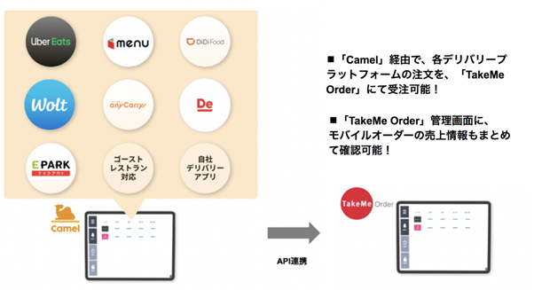 この度の連携により、「Camel」にて受注した各デリバリープラットフォームや、自社サイトの注文を、「TakeMe Order」にまとめて管理することができます。また、「TakeMe Order」の管理画面にて、各デリバリープラットフォームや、自社サイトからの売上情報に加え、テイクアウトなどのモバイルオーダーの売上情報も一元的に管理が可能になります。