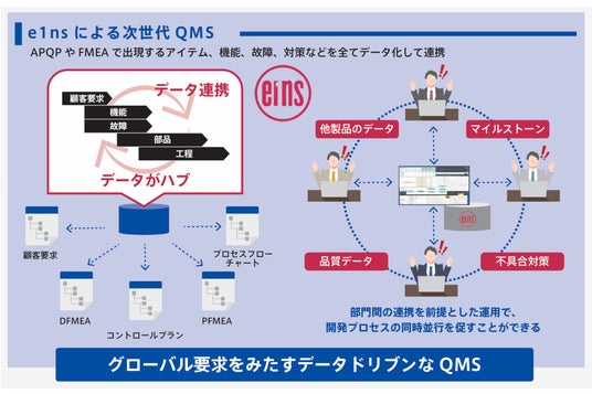 e1nsは、上記の要求事項を満たし、データドリブンな品質マネジメントを実現するソフトウェアです。製品開発フローにおける品質リスクに関するデータを一元管理して連携させ、組織間で共有・活用することで、グローバルレベルの品質マネジメントを実現する仕組みが用意されています。すでに全世界で1500社以上の導入実績があります。