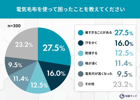 寒さが厳しくなる冬、手軽な防寒アイテムとして注目される「電気毛布」。一方で、「乾燥しそう」「寝苦しくならない?」といった不安から、導入を迷う声も少なくありません。快眠グッズ紹介サイト「快眠ランド」を運営するムーンムーン株式会社は、就寝時に電気毛布を利用したことがある人300名を対象に、使用実態や感じたメリット・デメリット、睡眠への影響について調査を実施しました。結果からは、多くの人が暖かさや寝つきの改善を実感する一方で、暑さや乾燥といった悩みも一定数存在することが明らかになりました。