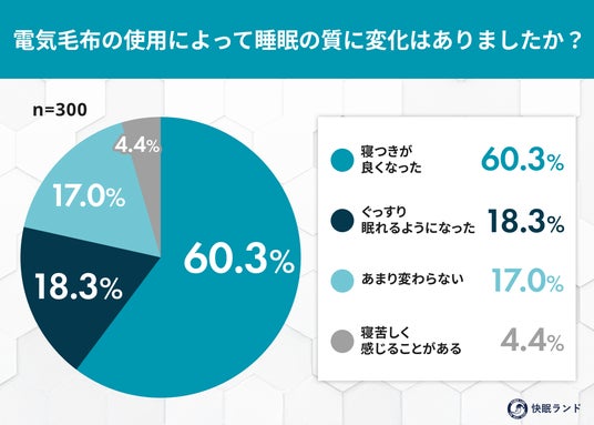 → 約8割が睡眠にポジティブな変化を実感。暖かさが入眠を助ける一方、少数ながら寝苦しさを感じる人も見られました。