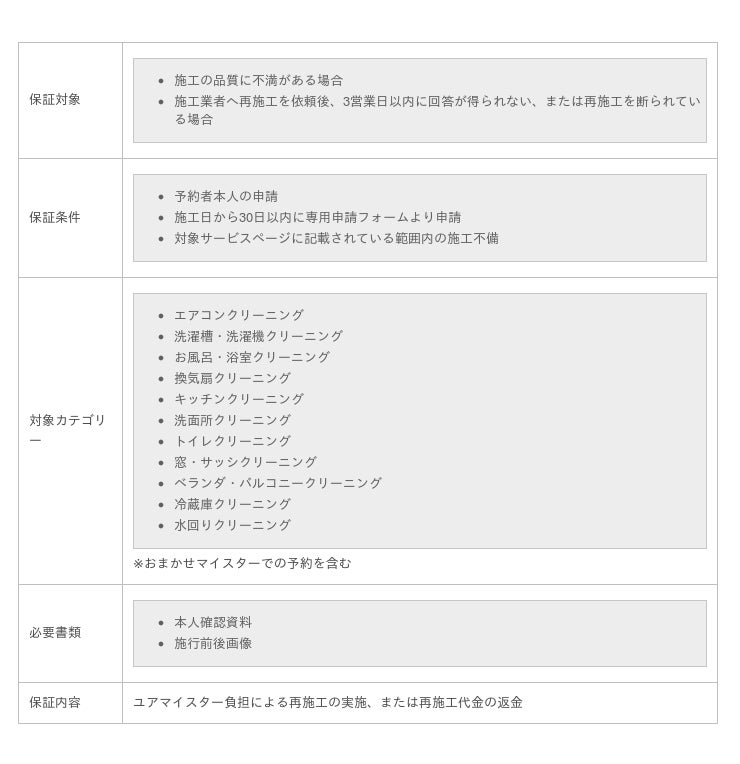 この度、ハウスクリーニングをユアマイスターで実施いただいた際、実施後の仕上がりにご満足いただけない場合、再施工をユアマイスター負担で実施する「ユアマイあんしん保証」を実施します。