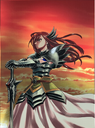 燃えるような夕焼け部分の発色や奥行感、光が当たった際の煌めきなどがミラー下地のため、より際立っています。さらに鎧や剣などの部分には艶出し加工を施しており、作品の荘厳な雰囲気を演出しています。