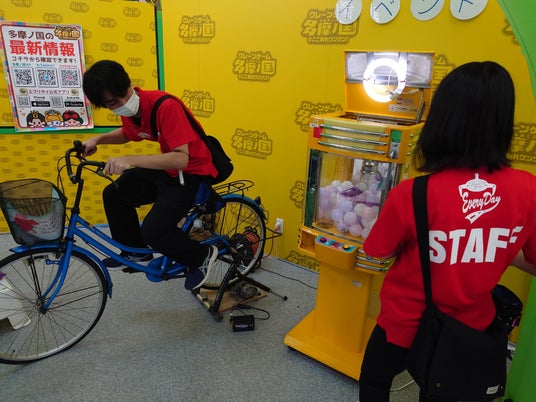 (※「自転車を漕ぐ人」1人と「クレーンゲームを操作する人」1人が必要なため)