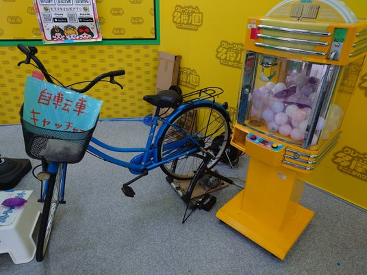 【遊び方】1名が自転車を漕いでいただき、もう1名がクレーンゲームを操作していただきクレーンゲームの中に入っている景品をゲットしていただきます。制限時間はなく景品が1個とれるまで挑戦をしていただけます。
