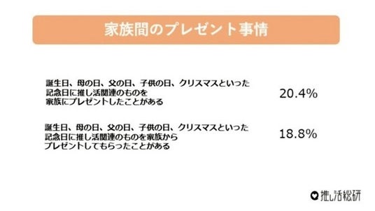家族同士の誕生日や記念日に「推し関連のもの」をあげた・もらったことがある人は、家族推し活をしている人の約2割。割合はまだまだ大きくないですが、プレゼント選びの新たな基準として、今後のプレゼント市場の動向に影響を与える可能性があります。