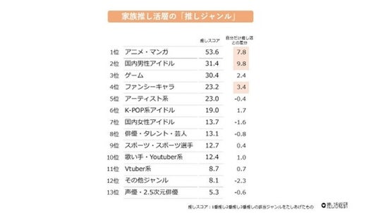 家族で推し活をしている層で顕著に多い推しジャンルは、「アニメ・マンガ」「国内男性アイドル」「ファンシーキャラ」(サンリオ・ちいかわ・ディズニーなど)。