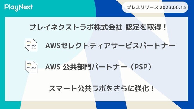 プレイネクストラボ株式会社(本社:東京都品川区、代表取締役:柏 匠、以下「プレイネクストラボ」)はこのたび アマゾン ウェブ サービス(以下、AWS)の「AWSセレクトティアサービスパートナー」および「AWS 公共部門パートナー(PSP)」の認定を取得しました。