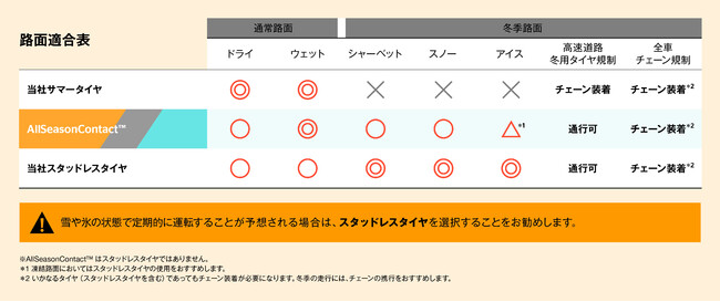 オールシーズンタイヤは、夏と冬のドライブに求められる性能を両立したタイヤです。突然の降雪など急な天候変化にもより安心・安全な走行が可能で、年間を通じて履き続けることができるため季節ごとのタイヤ交換やタイヤ保管のスペース確保の必要がなく、利便性・経済性の面でも優れた、ドライバーにとっての新しい選択肢となるタイヤです。
