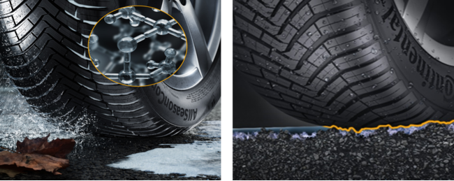 AllSeasonContactには、コンチネンタルのウィンタータイヤの開発で培われたコンパウンドテクノロジーが多く採用されています。シリカを高比率で配合した「トラクション・シリカ・コンパウンド」は、冬の冷たい雨道で優れたブレーキ性能を発揮します。特殊な樹脂「ウィンター・パフォーマンス・レジン」を配合したトレッドコンパウンドにより、スノー性能と相反するドライ、ウェット、そして転がり抵抗性能をより高次元で両立しながら低温下でもゴムの柔軟さを最適に保ち、積雪路でも良好なグリップ力を発揮します。