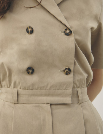 きれいめで仕上がる張り感のあるファブリックと、フロント部分のダブルボタンで上品かつきれいめに仕上がるデザイン。