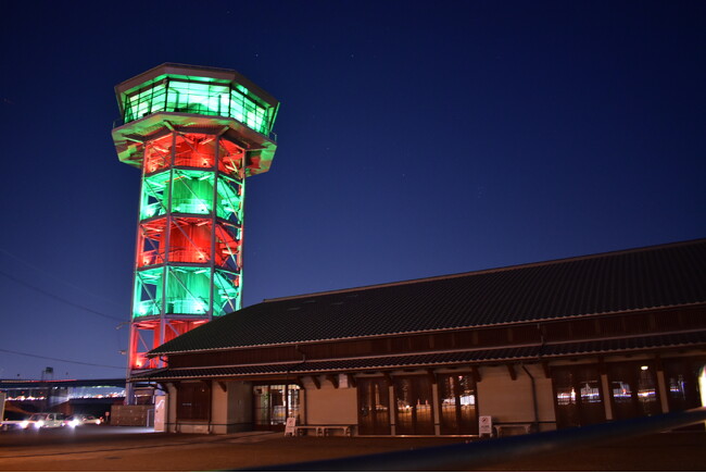 夜空に幻想的に浮かび上がる、クリスマスカラーに彩られた展望塔を、お楽しみください♪