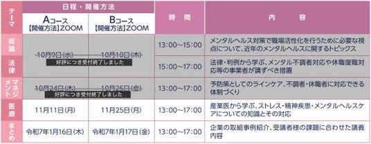 11月11日・25日に開催の講座では「医療」をテーマとし、事例を通してメンタルヘルス対策に関する知識の習得を目指します。また、2025年1月16日・17日の講座では、前半に実際のメンタルヘルス対策に取り組む企業事例をご紹介し、後半は講師によるまとめの講義を行います。