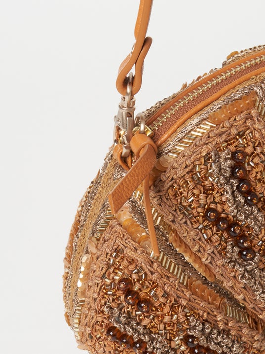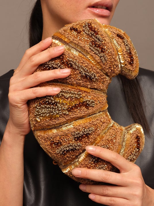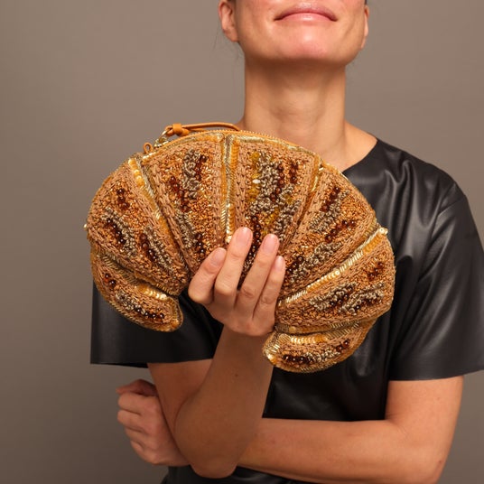 ジャマン・ピュエッシュの手仕事がふんだんに詰まったクロワッサンモチーフのバッグ。焼き上がったばかりのような琥珀色の美しいグラデーションを、インドの熟練職人たちが卓越した技術を駆使し、繊細なビーズワークで緻密に表現しています。本物のクロワッサンのように微かに輝くその光沢感は、まるで宝石のよう。普段使いのバッグとしても、特別な日のディナーシーンでも、その個性的なデザインで注目を集めること間違いなしです。