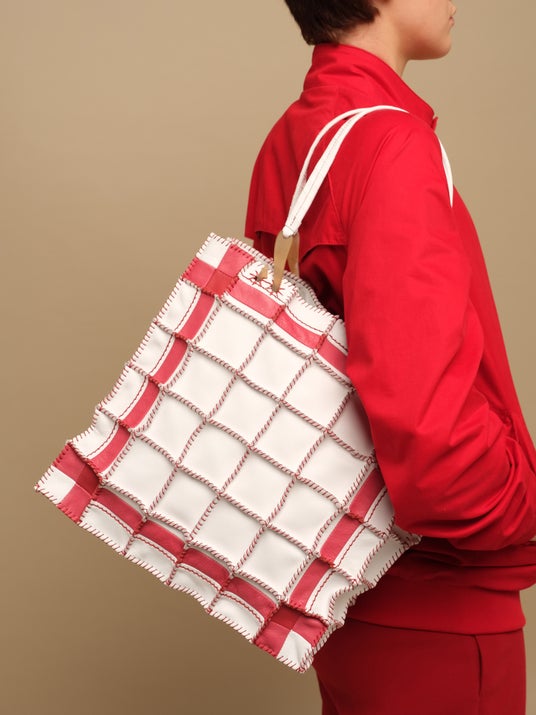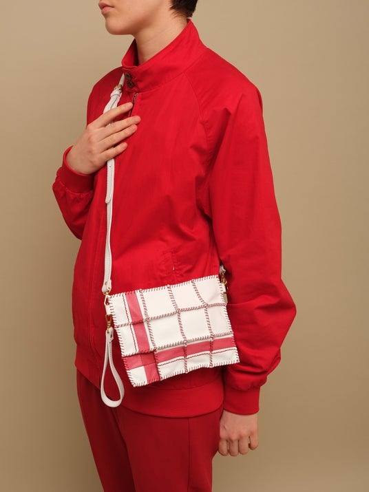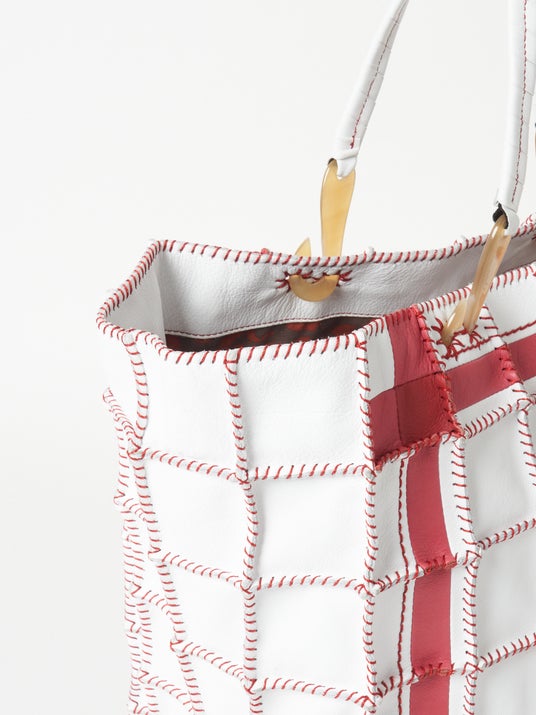 新作では、四角いレザーを手作業でつなぎ合わせて作られる「オヌ」の特徴であるハンドステッチを、赤いチェックのラインに見立てて柄を表現。また、クロスのラインもプリントではなく、赤いレザーを継ぎ合わせて作られており、その手の凝りようが際立ちます。「オヌ」の ロングセラーモデルであるトートバックに加え、デイリーに使いやすいポシェットタイプのポーチバッグの2型が登場いたします。