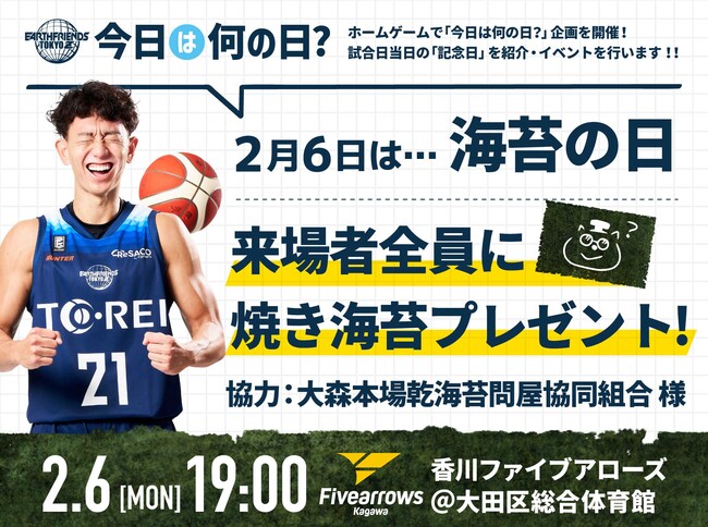 2月6日の香川ファイブアローズ戦では、大森本場乾海苔問屋協同組合様(https://www.oomori-norikumiai.com/)の協力で、入場者みなさまへ海苔のプレゼントがあります。当組合は、「1300年にわたり大事な日本の食文化として育てられてきた『海苔』の美味しさを、未来永劫、伝えていくのが我々の役目であると信じております」と話されています。