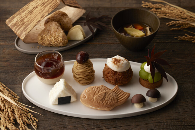 「芋 栗 新米!秋のまんぷくアフタヌーンティー」では、収穫の秋をイメージし、芋や和栗、新米などを贅沢に使用したスイーツをお楽しみいただけます。新米と魚とほうじ茶という、日本ならではの秋の豊かな食卓からインスピレーションを受け、和をテーマに仕上げました。代表的な秋の味覚として知られている「芋・栗・南瓜」は、江戸時代に、女性が好きなものとして「芝居蒟蒻芋南瓜(しばい・こんにゃく・いも・かぼちゃ)」など語呂よく並べた言葉が由来となったといわれています。今回、ハイアット セントリック 銀座 東京では、遥か昔より女性が好んでいた秋の味覚、芋と栗にアクセントとして新米を追加し、ご用意しました。他にも、林檎やマスカットなどの旬のフルーツを使ったスイーツ、セイボリーには、アフタヌーンティーには珍しいおにぎりと具沢山の味噌スープを揃えています。日本の秋の食卓を感じられる、満足感たっぷりなアフタヌーンティータイムをお楽しみください。