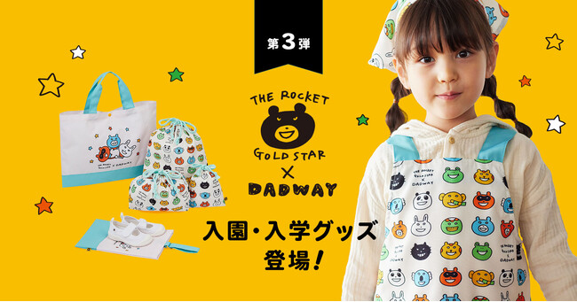 株式会社ダッドウェイ(本社:神奈川県横浜市、代表取締役社長:大野 浩人)は、イラストレーターTHE ROCKET GOLD STAR (ザ・ロケット・ゴールド・スター)とのコラボレーション第三弾として、入園や入学の準備に欠かせないスクールバッグ、巾着、シューズバッグに、コップとエプロンを加えた5商品を全国のDADWAY店舗(一部店舗を除く)とオンラインストア限定で発売します。